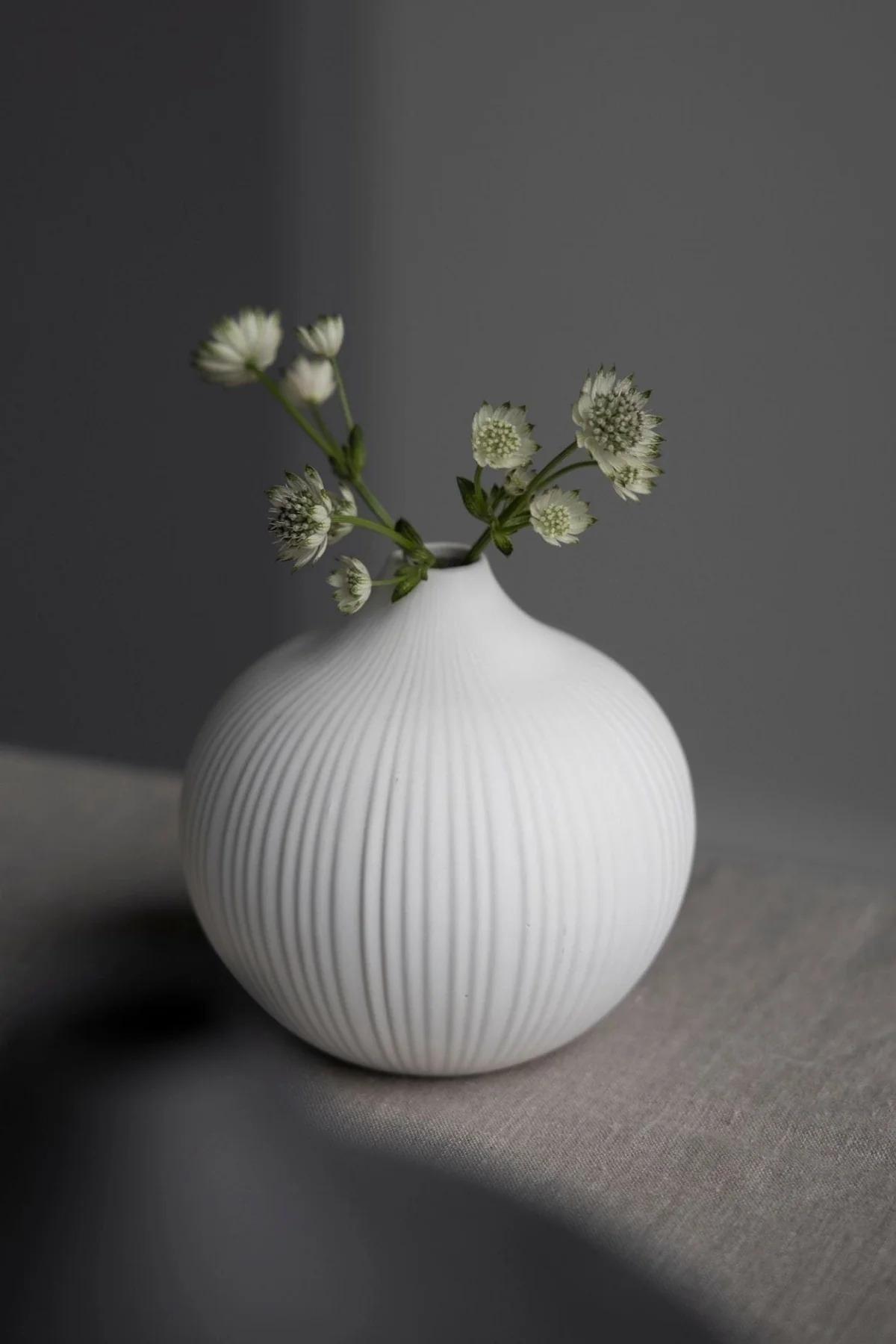Štýlová keramická váza FRÖBACKEN White švédskej značky Storefactory má jemný vrúbkovaný povrch a príťažlivý guľovitý tvar. Do malého otvoru môžete umiestniť výrazný kvet, kvitnúci konárik alebo sušené trávy.